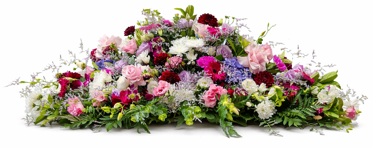 Our casket covers are a size that covers the coffin / casket just leaving enough room for a photo and/or other special items. All our mixed seasonal casket covers are included in our packages (except for the Direct Cremation No Service Package).